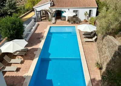 - Extra large swimming pool (16×5 meters), with sun loungers and parasols